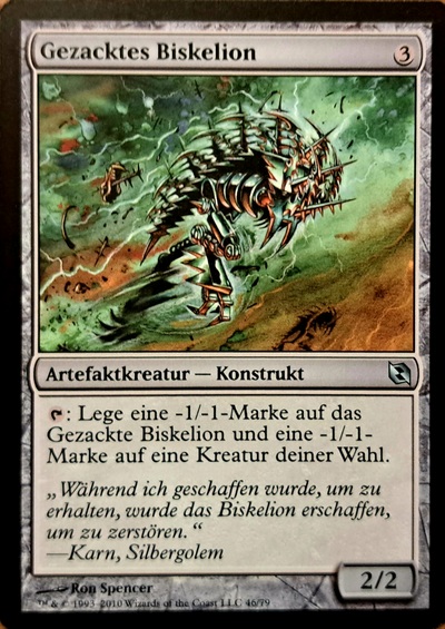 Also leider kann das „Biskelion“ ja nur 2x seine -1/-1-Marke werfen, dann ist es selbst tot. Wenn man eine Ausrüstung beifügt, welche die Widerstandskraft des „Biskelion“ erhöht, kann es öfter seine -1/-1-Marken werfen!